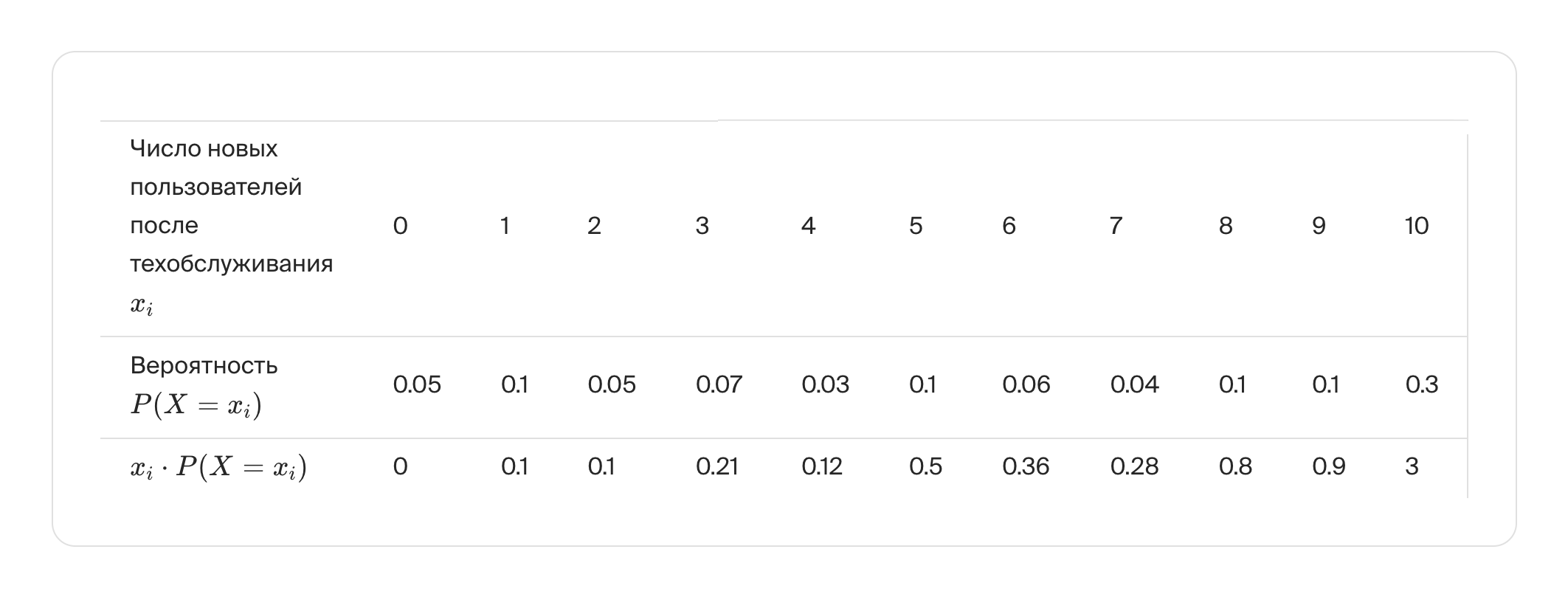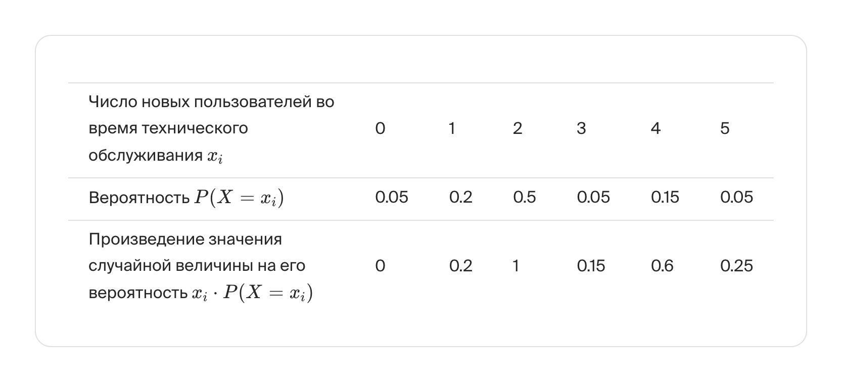 Чтобы вычислить математическое ожидание дискретной случайной величины «Число новых пользователей после технического обслуживания» по формуле E[X]=∑P(X=xi)xi, добавим в таблицу строчку с величиной произведения значения случайной величины на её вероятность xi⋅P(X=xi)):