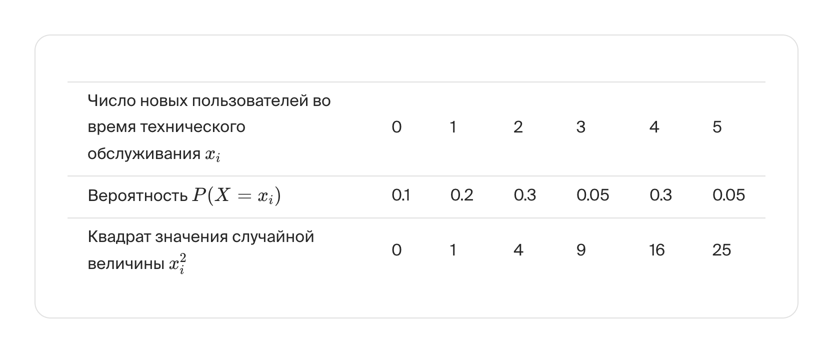 Вычислим дисперсию дискретной случайной величины «Число новых пользователей во время технического обслуживания» по формуле Var[X]=E(X^2)−(E(X))^2. Добавим в нашу таблицу строчку с величиной квадрата значения случайной величины xi^2: