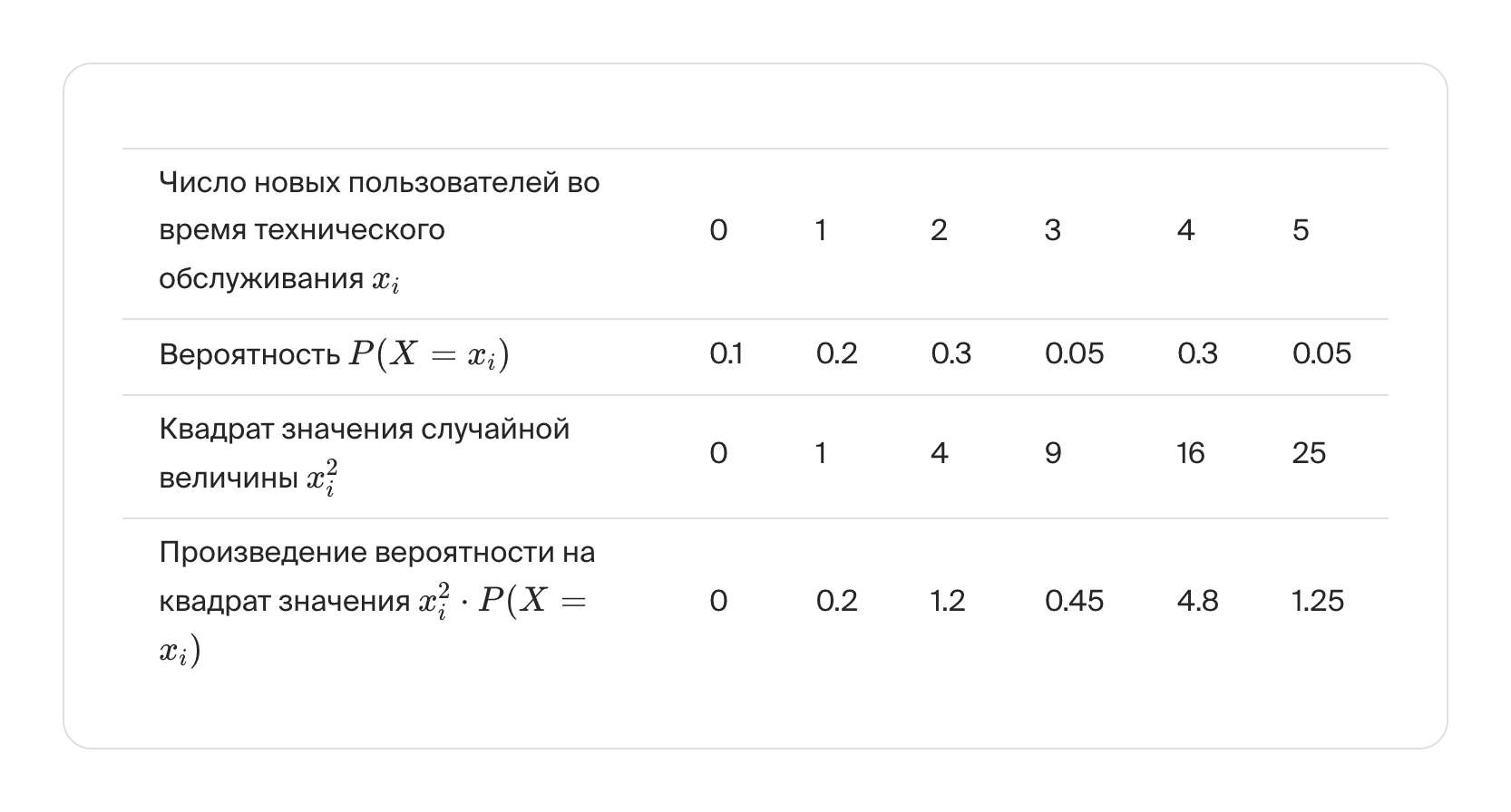 Чтобы вычислить математическое ожидание дискретной случайной величины «Число новых пользователей во время технического обслуживания» по формуле E[X]=∑P(X=xi)xi, добавим в таблицу строчку с величиной произведения значения случайной величины на её вероятность xi⋅P(X=xi):